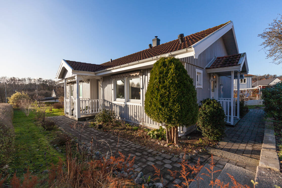 Välplanerad enplansvilla om ca 100 kvm boarea jämte separat garage och förråd. Vardagsrum med utgång till en härlig solaltan i västerläge, kök, 3 sovrum, badrum, gästwc, tvättstuga m m.