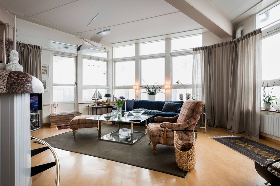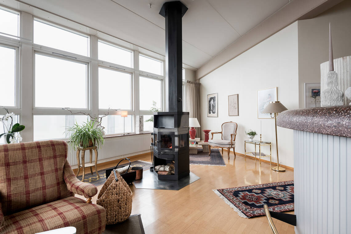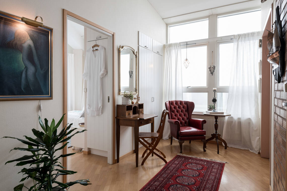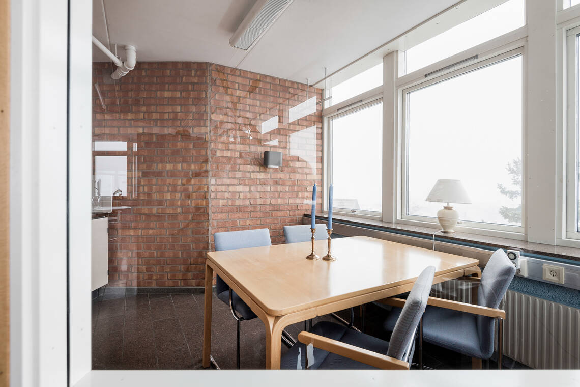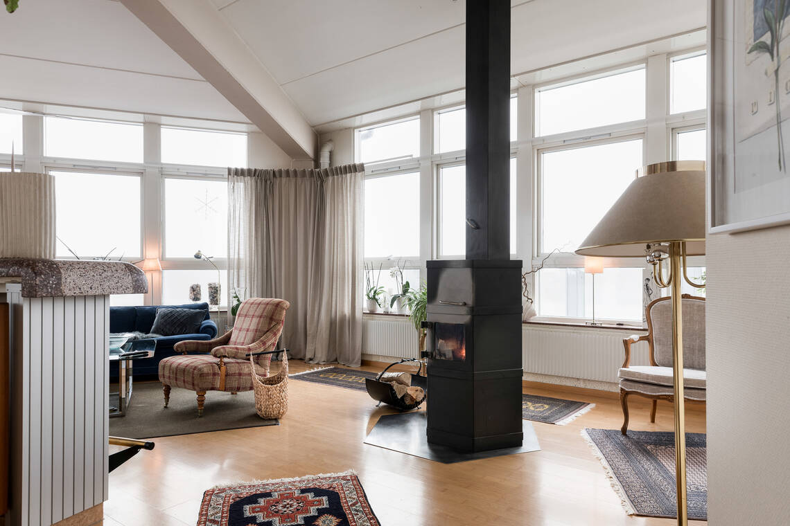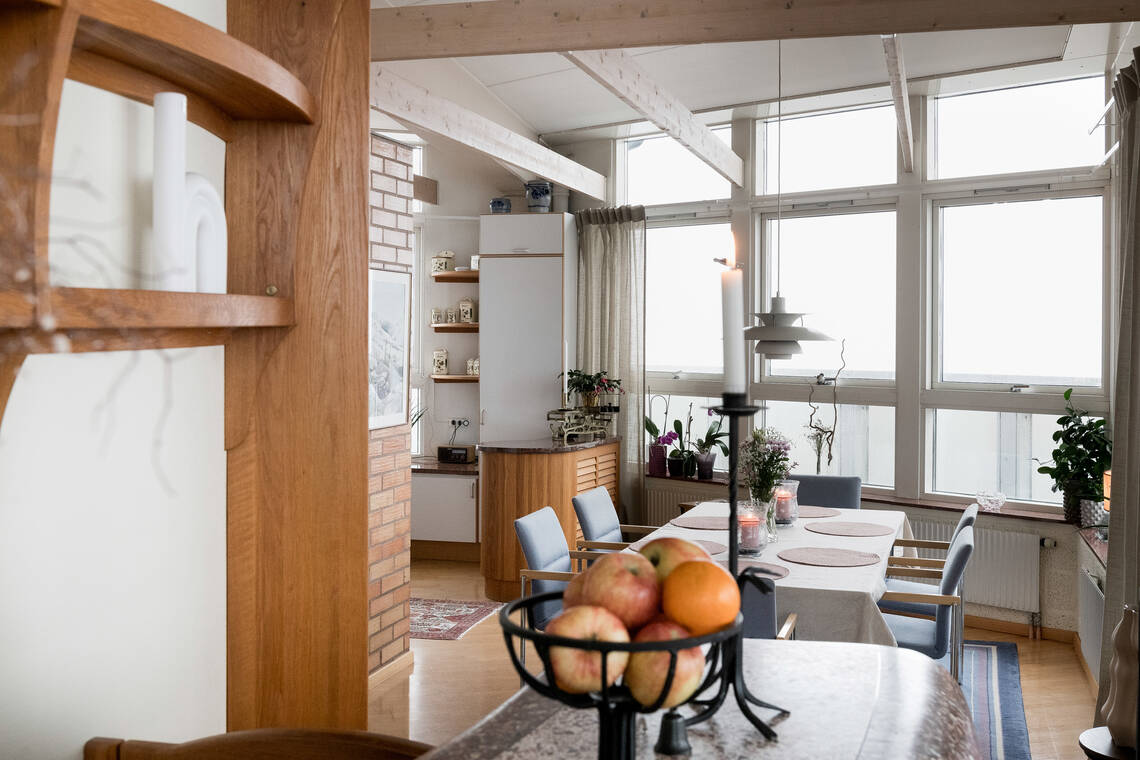 På tredje våningen finns en fräck lägenhet om 130 kvm boarea med sällskapsutrymmen, kök med matsal, 2 sovrum, badrum, bastu och dusch, utgång till balkong runt hela tornet med vidsträckt utsikt.