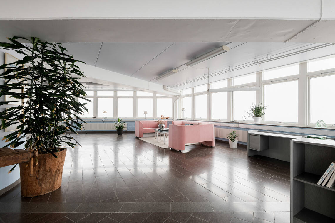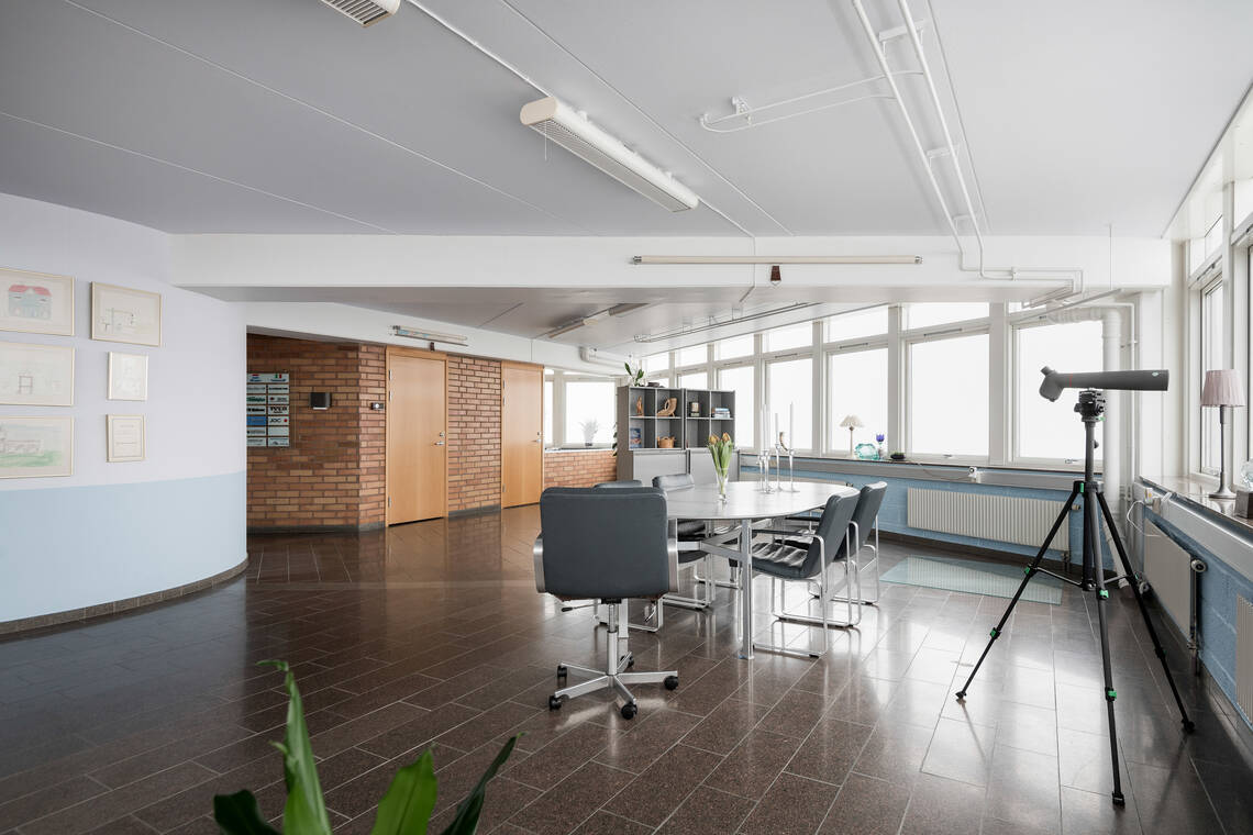 På andra våningen finns kontor/utställningslokaler om ca 180 kvm lokalarea .