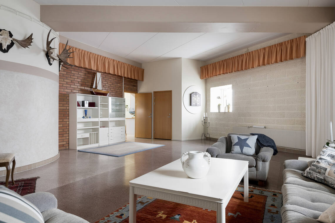 På entréplanet finns en rejäl entréhall, en lägenhet med stort vardagsrum, sovrum, badrum och stora förrådsutrymmen.