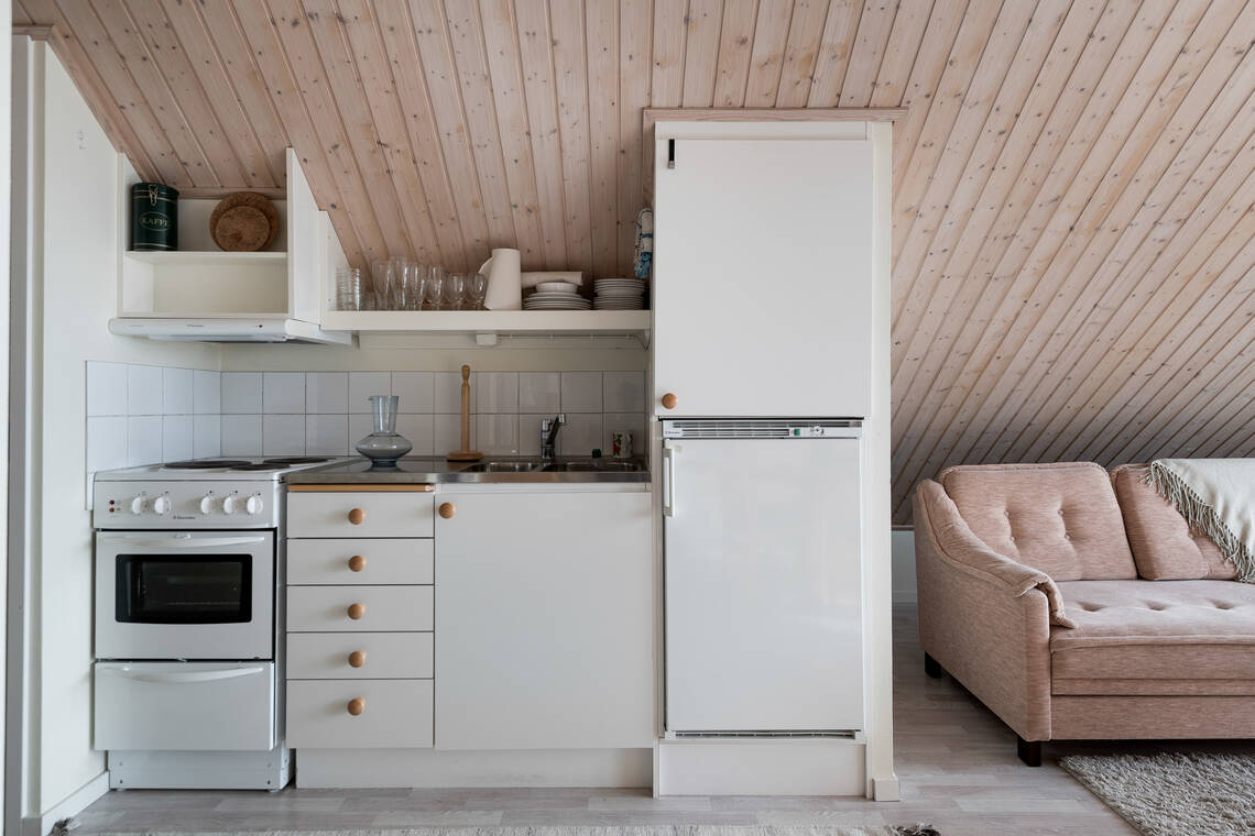 Ovanpå garagebyggnaden finns en lägenhet om 35 kvm med TV/allrum, pentry, sovrum och badrum.